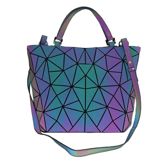 Maletas, bolsos y carteras con diseños geométricos y acabados reflectivos.