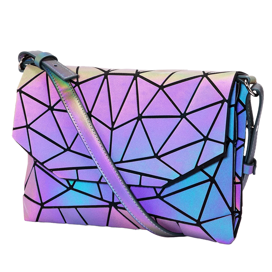 Maletas, bolsos y carteras con diseños geométricos y acabados reflectivos.
